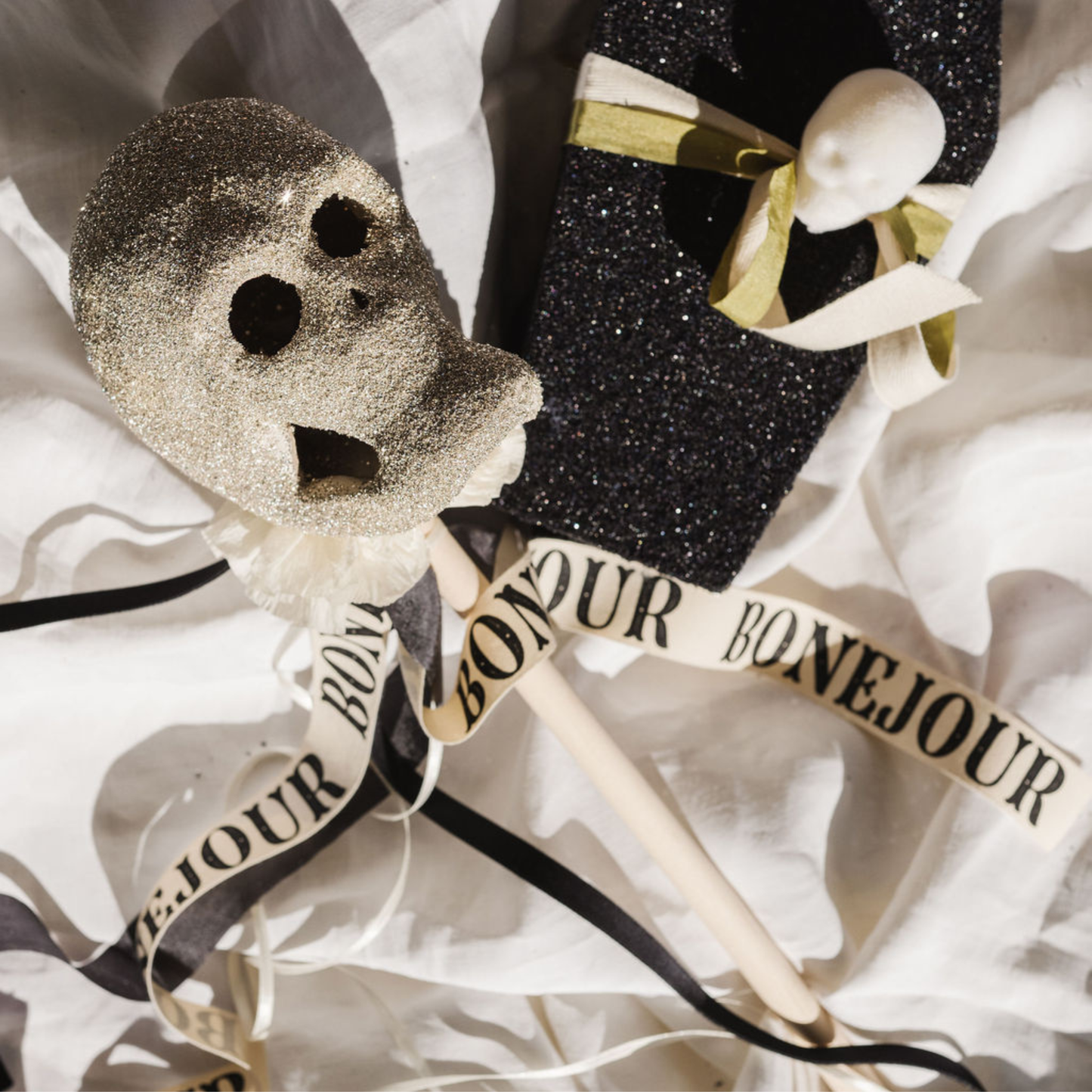 Features: Each piece is carefully crafted and dusted in glitter, a small skull or spider adorns the top, tied with a soft ribbon for a charmingly eerie finish. Perfect for styling on shelves, tabletops, or tucked into seasonal vignettes.