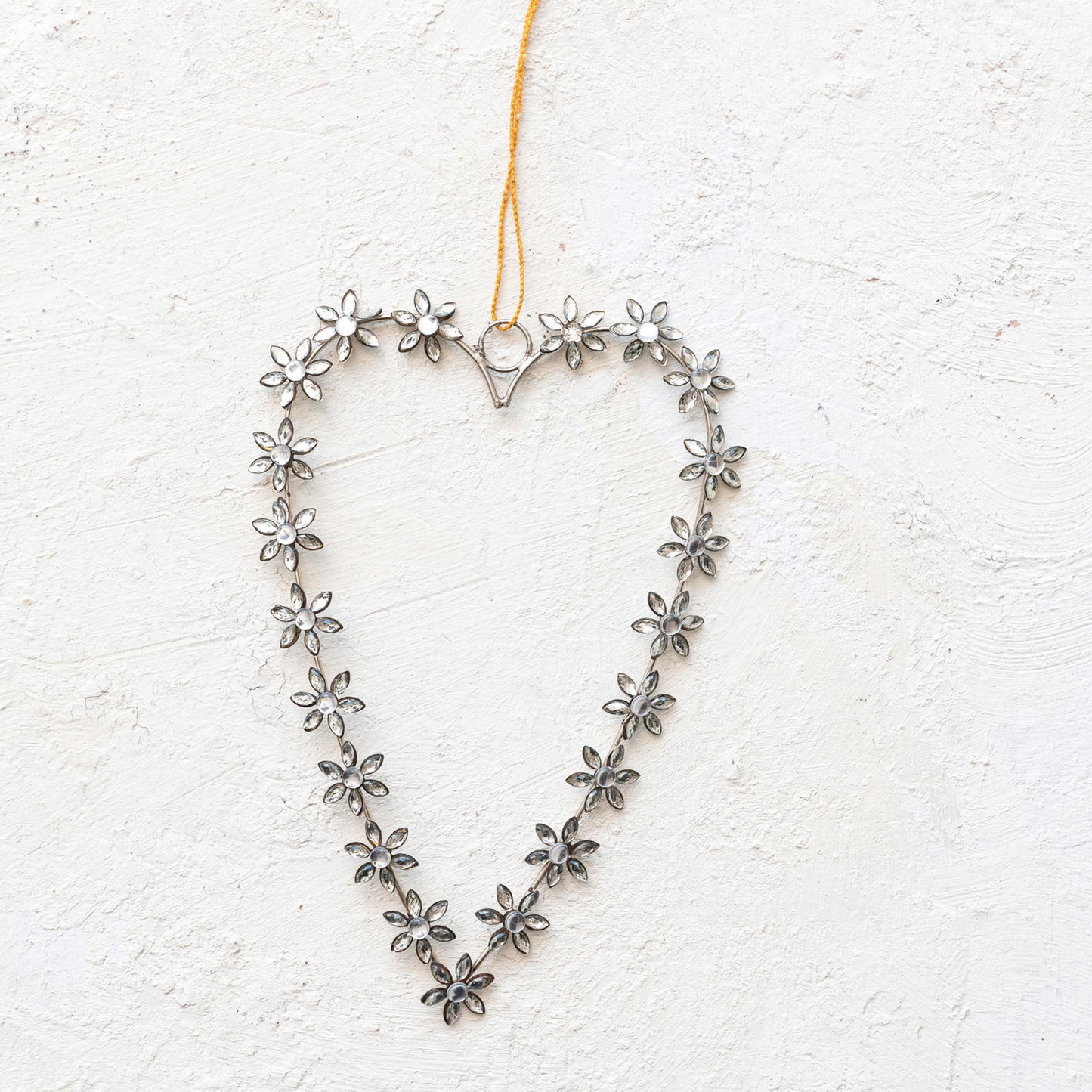 Add Glass Beaded Metal Heart Ornament with Jeweled Flowers, Silver Finish to the cart