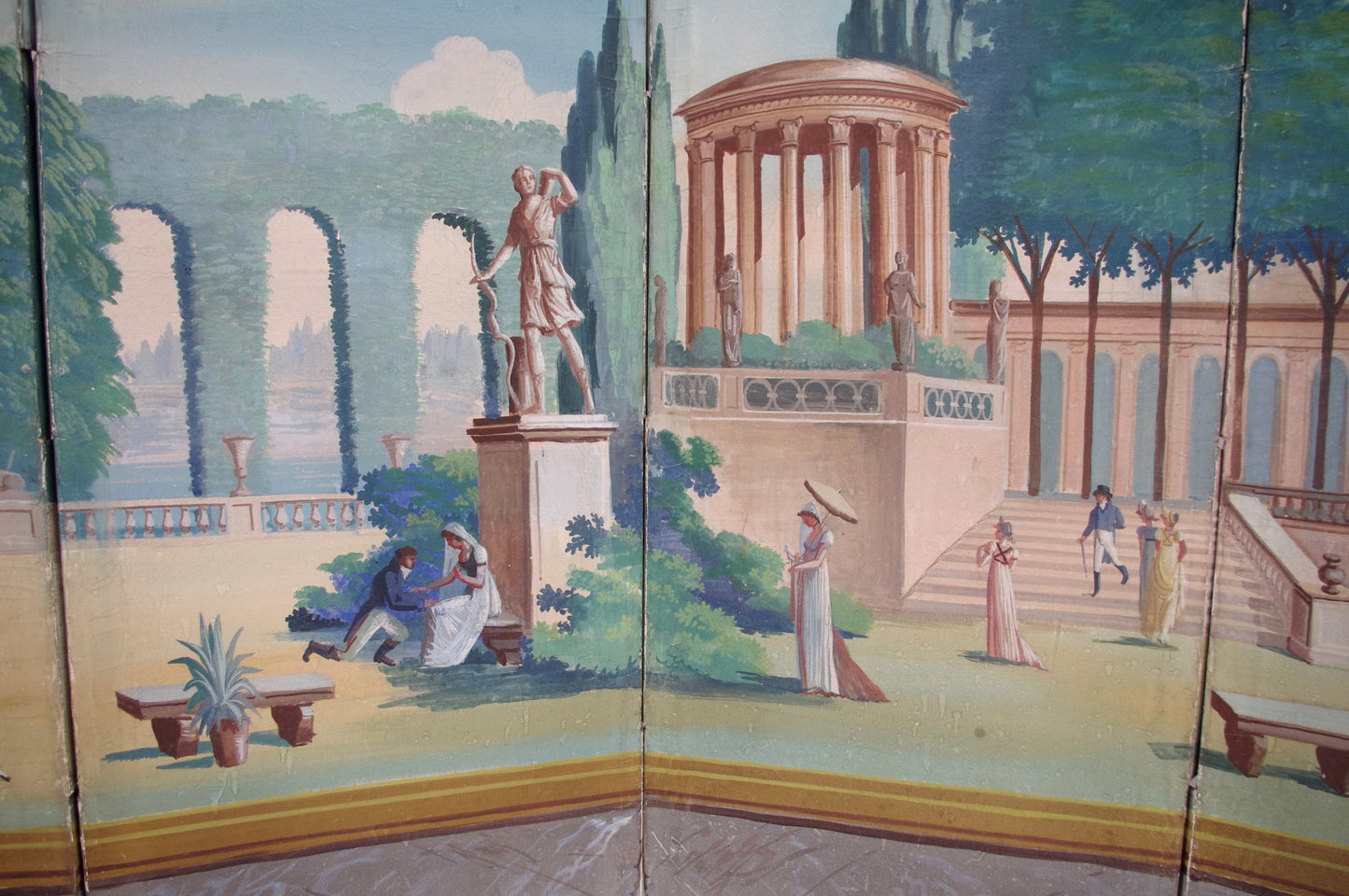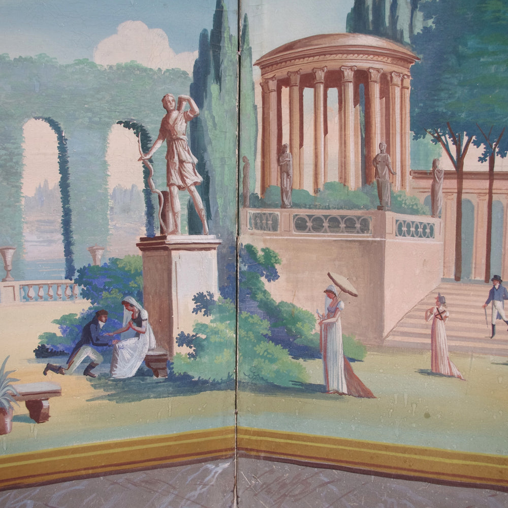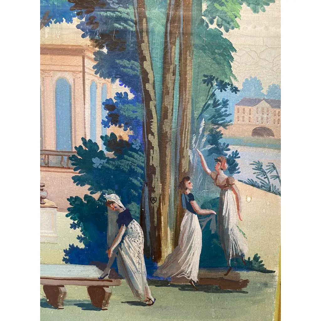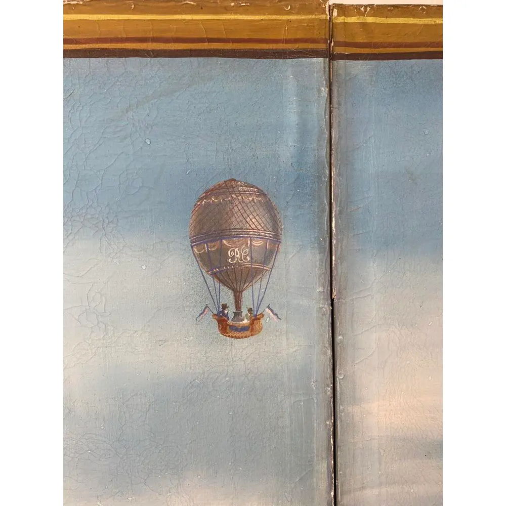 This gorgeous Directoire period paravent/privacy screen is filled with great period subject matter like the latest in directoire period technology (hot air balloons), as well as the latest in current fashion and architectural style. This piece is truly special. Has some wear consistent with age, and a tiny bit of modern graffiti in the form of a heart with initials drawn on a tree. The back side of the screen is just as lovely as the front, which makes this the perfect piece to use as an actual room divider. Each panel is 20.75".