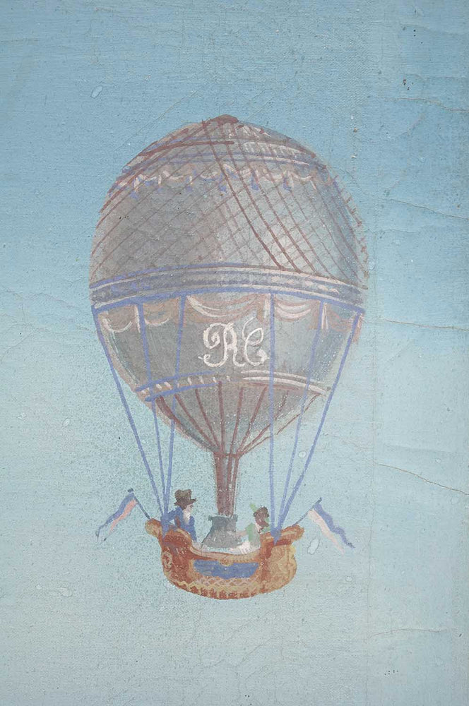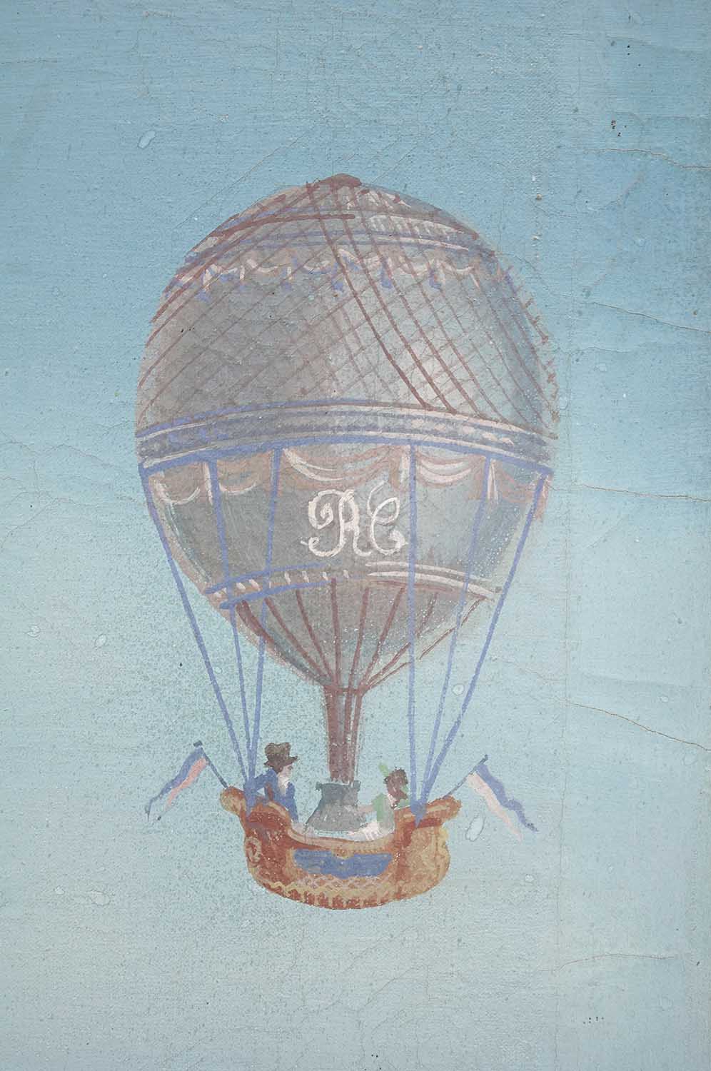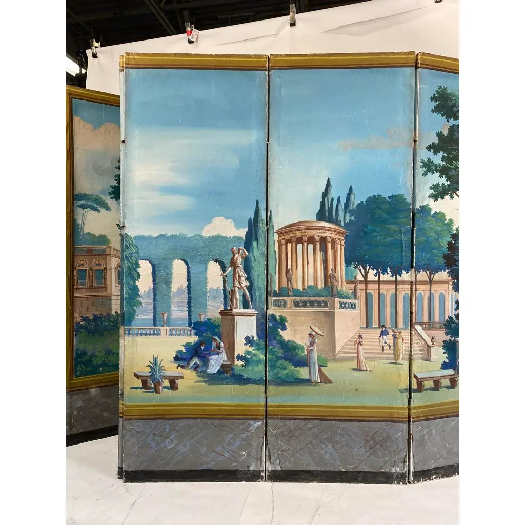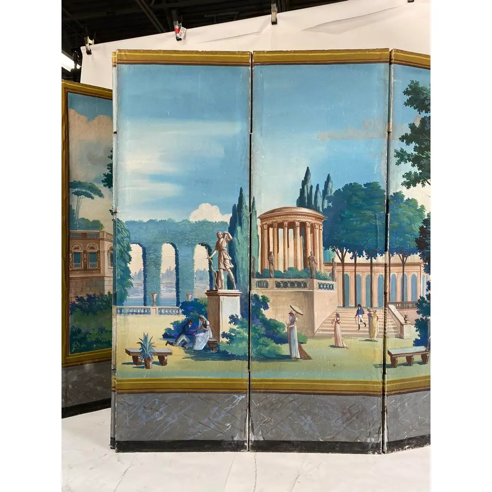 This gorgeous Directoire period paravent/privacy screen is filled with great period subject matter like the latest in directoire period technology (hot air balloons), as well as the latest in current fashion and architectural style. This piece is truly special. Has some wear consistent with age, and a tiny bit of modern graffiti in the form of a heart with initials drawn on a tree. The back side of the screen is just as lovely as the front, which makes this the perfect piece to use as an actual room divider. Each panel is 20.75".