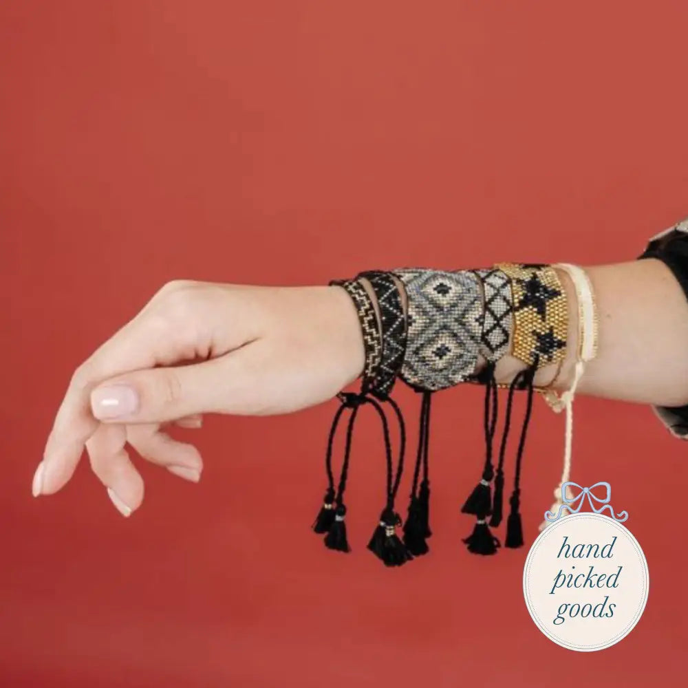This elegant, handcrafted bracelet features flat black beads interwoven with striking gold accents, creating a sophisticated contrast. Its adjustable style and modern design make it a versatile accessory, perfect for adding a touch of elegance and sophistication to any outfit.