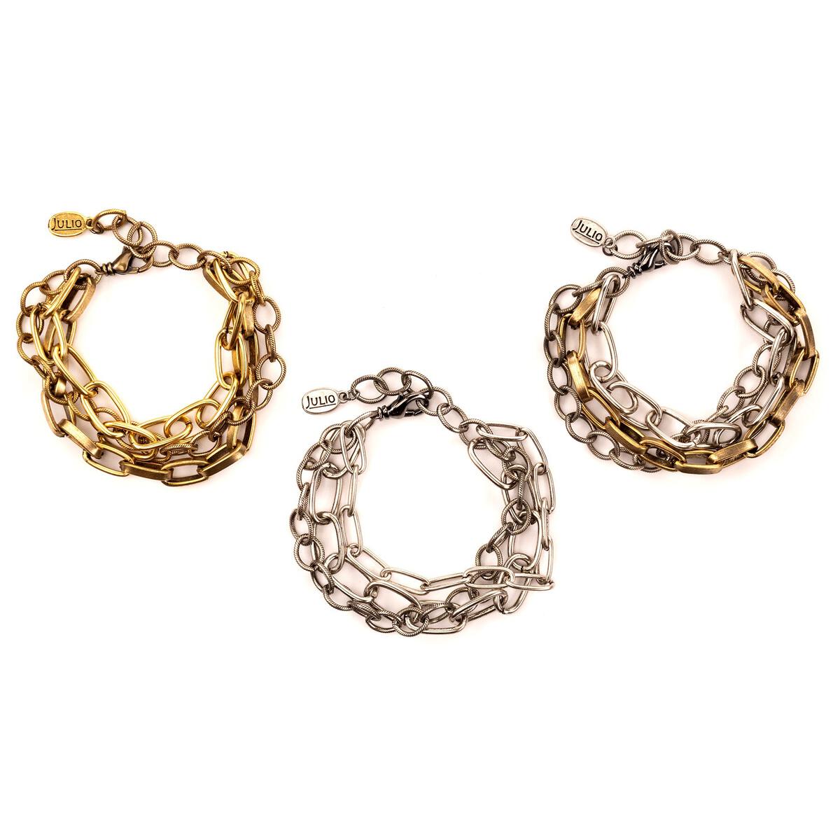 The Rustica bracelet features layers of assorted chunky chains, creating a bold, textured look that's both rustic and chic. Finished with a swivel lobster clasp for easy wear, this statement piece adds a touch of edgy elegance to any outfit. Perfect for stacking or wearing solo for an eye-catching accessory. 8.5" overall length adjusts to fit most wrists.