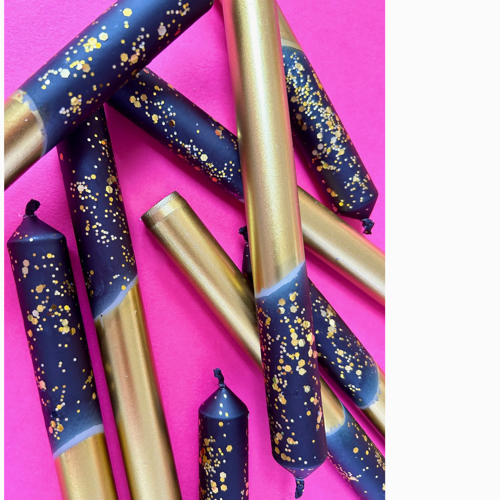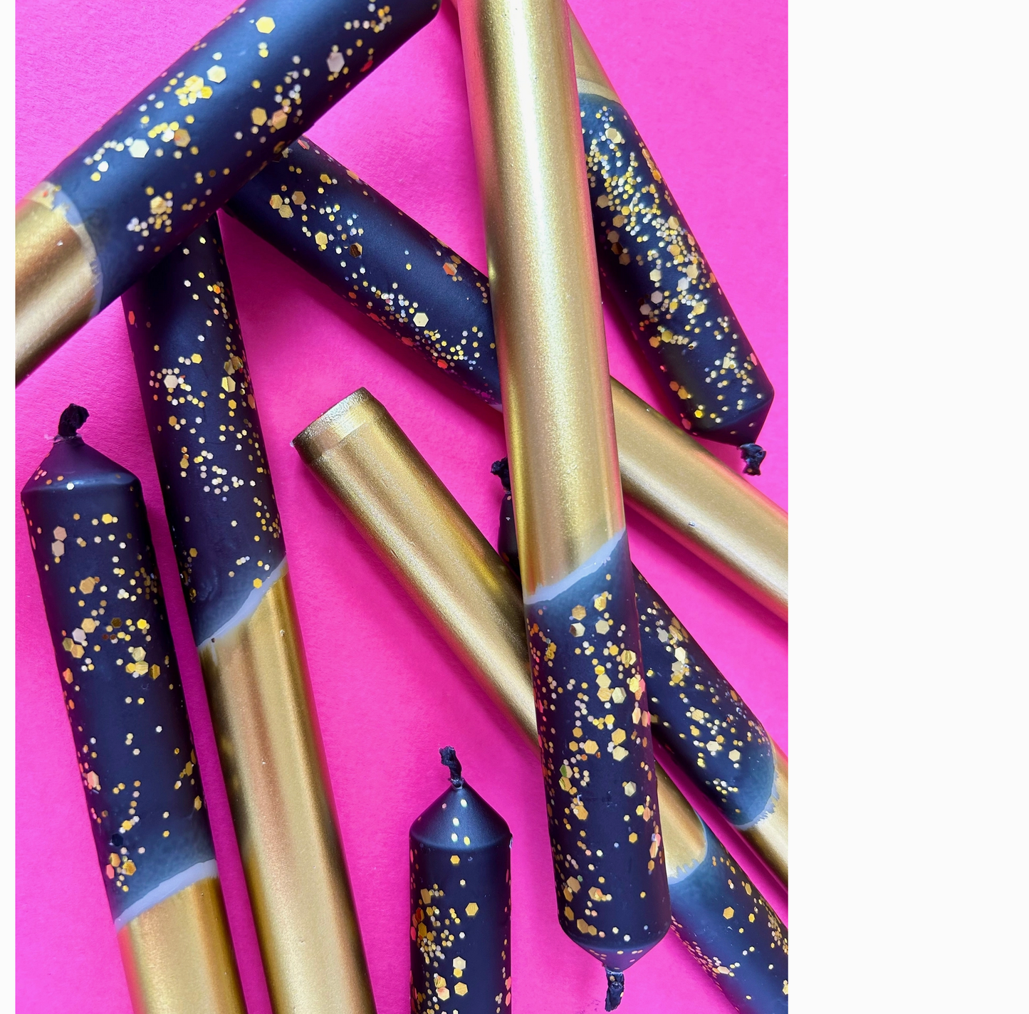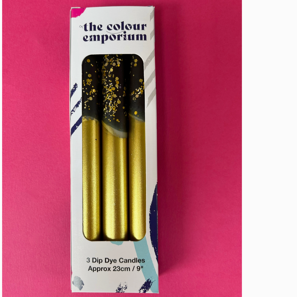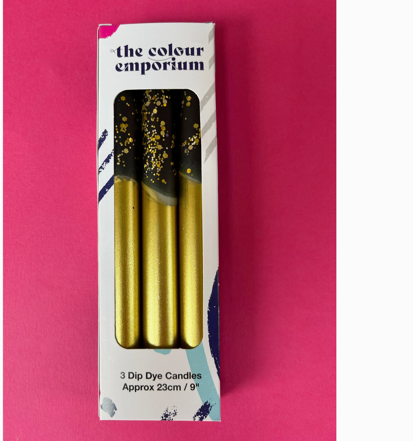 The Colour Emporium presents this festive dip dye trio in sophisticated black and gold perfect for a chic dinner or New Year’s Eve party for this season. These candles will brighten up your festive decor and will bring a unique twist to the dining table during dinner. Partner with bright Colours such as pink or purple to really make them pop. Each trio of candles is hand dipped in the Surrey Hills and every set is unique - the color combination is always the same but the pattern will vary slightly.