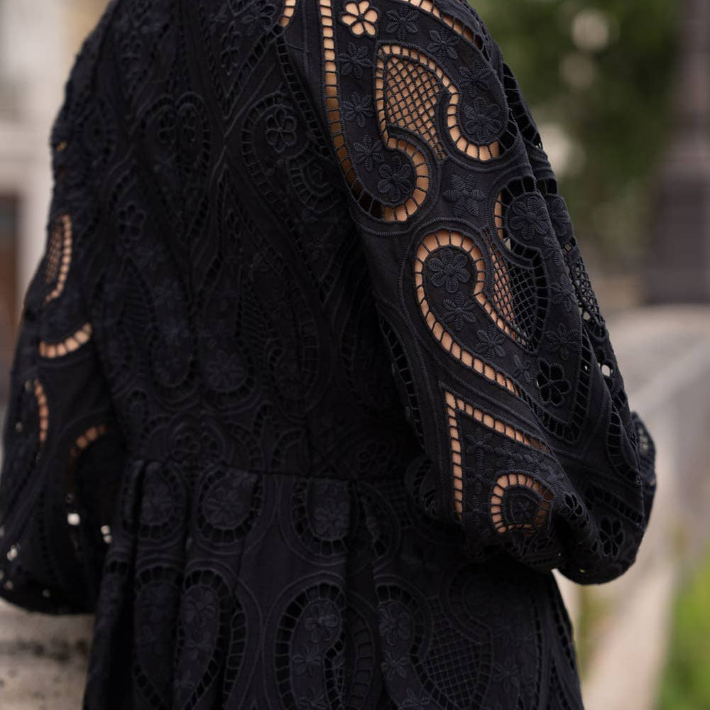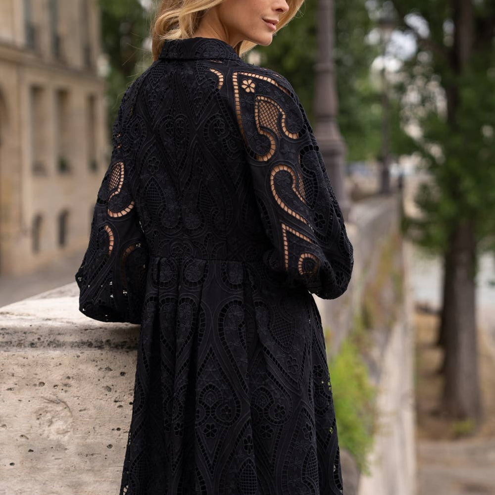 Features: Embroidered cotton lace dress: shirt collar, front buttoning, slightly puffed long sleeves, fitted waist and flared bottom, inner lining.