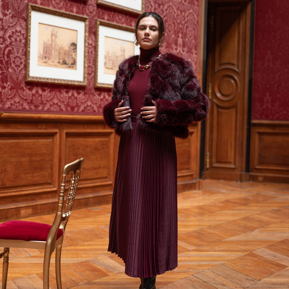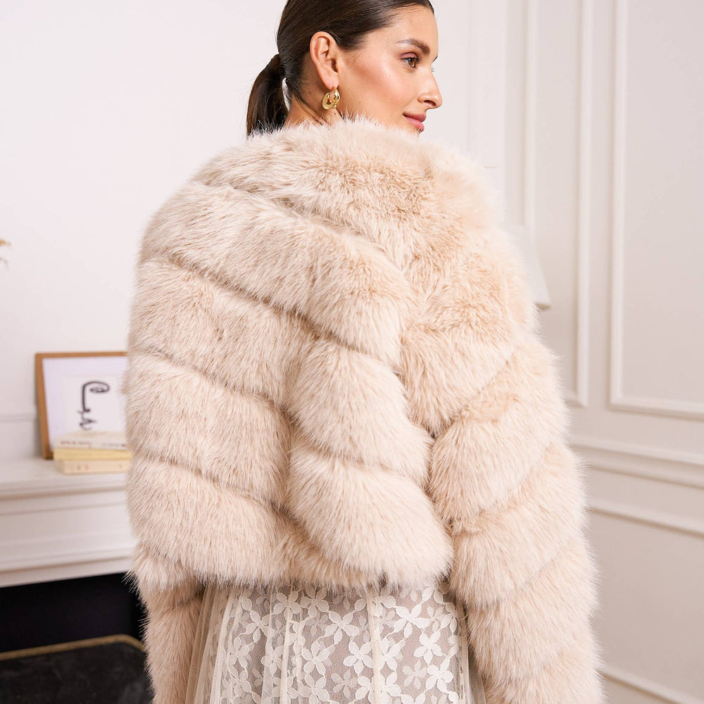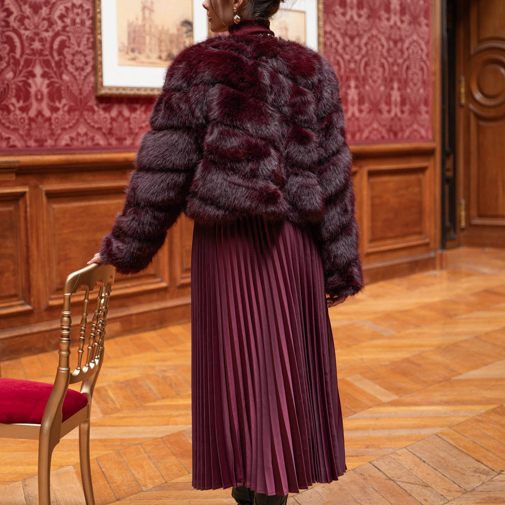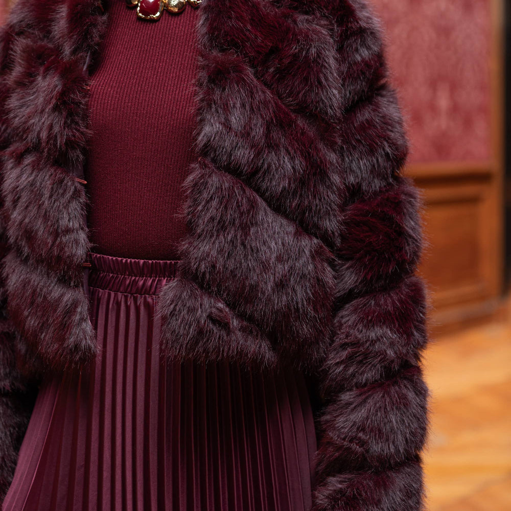 Features: Short faux fur jacket, long sleeves, front fastening buttons.