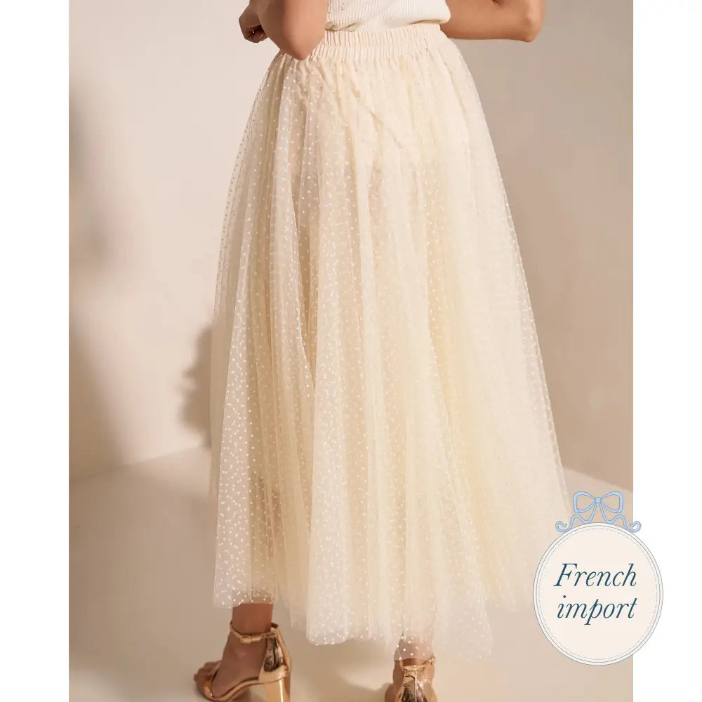 Regular price $88.90Features: Long tulle ecru skirt with plumetis (velvet polka dots) and a fine elastic waistband. Playing with volumes, this iconic skirt stands out with a flared cut, enhanced with gathers, offering a ruffled effect at the bottom.