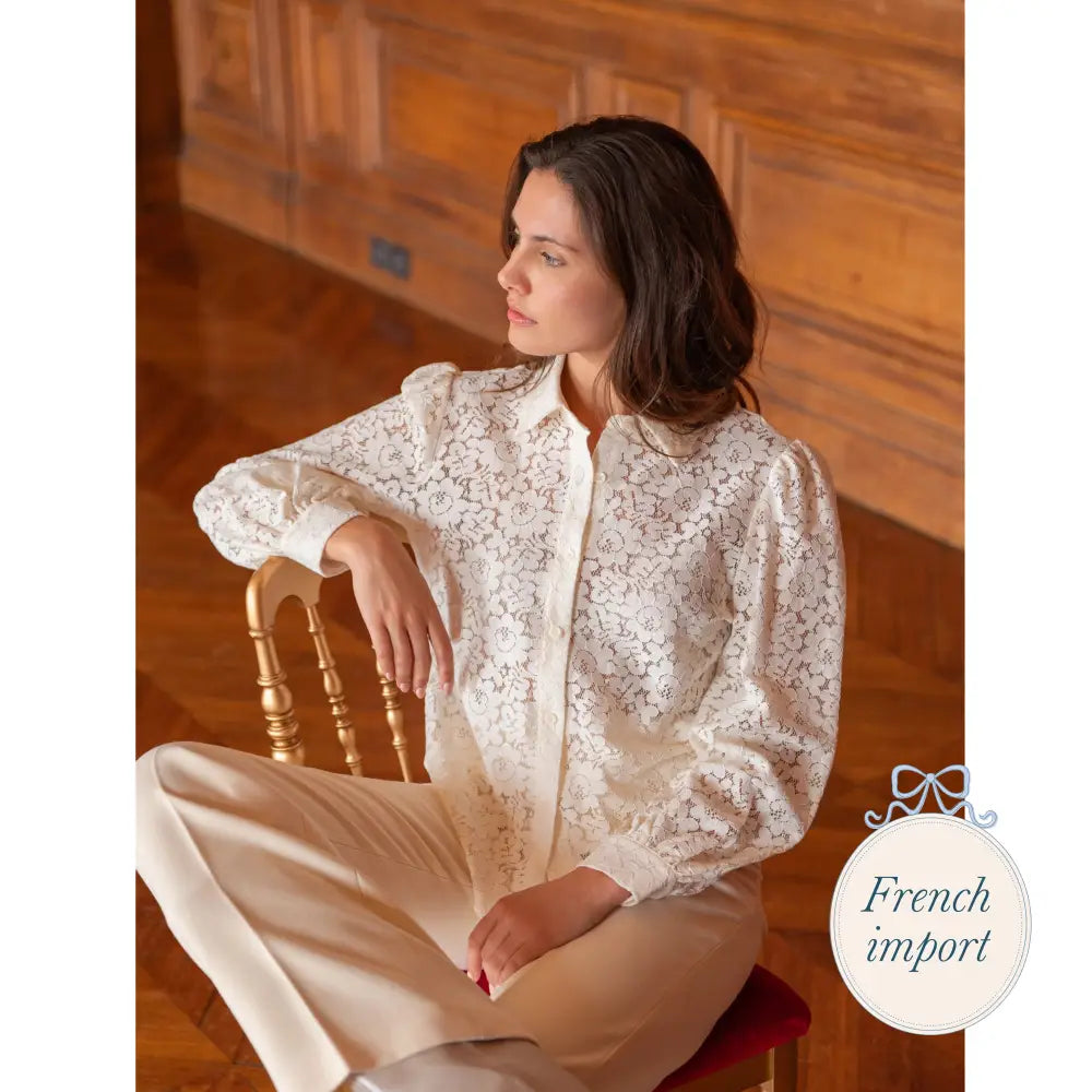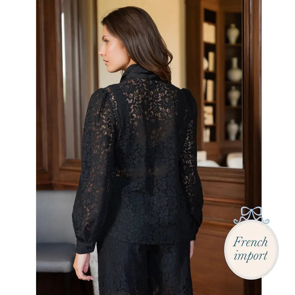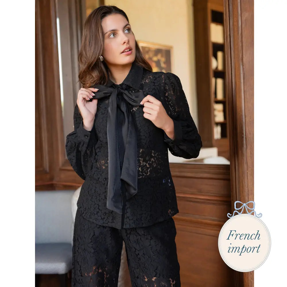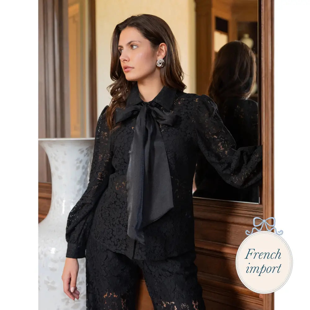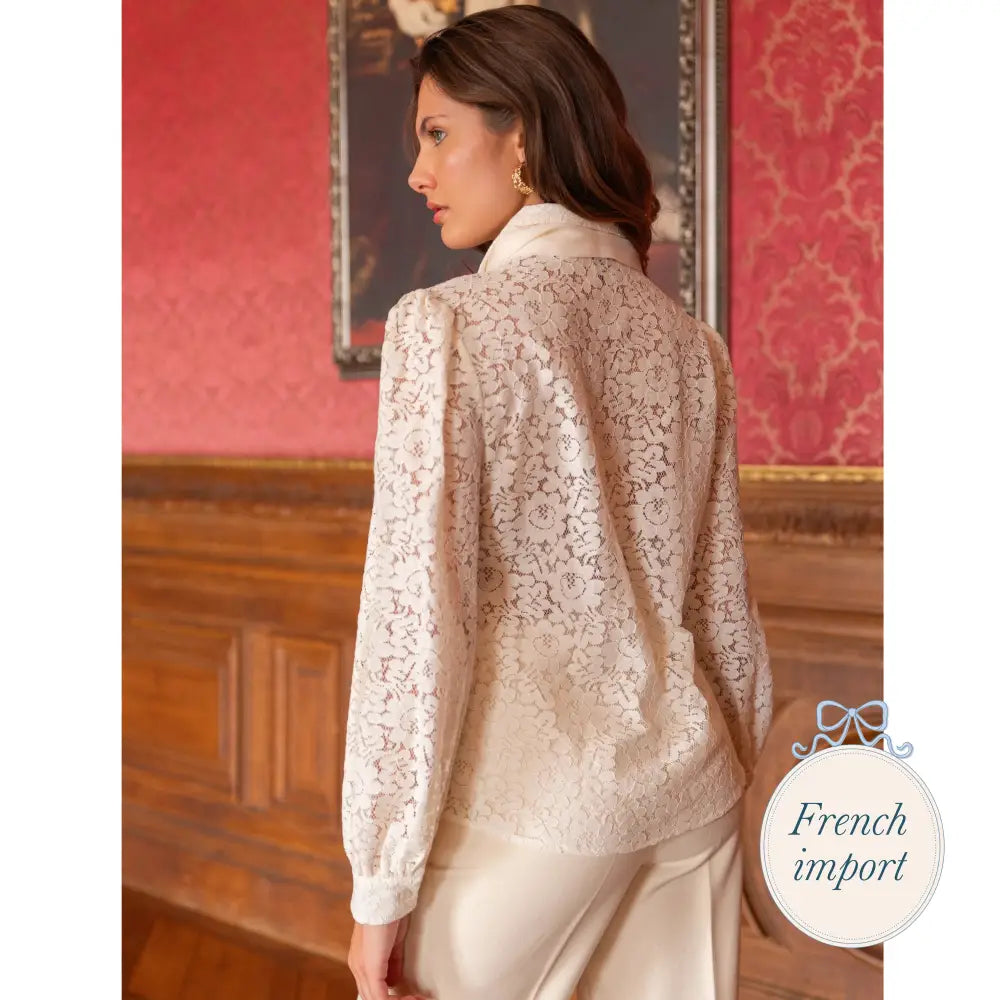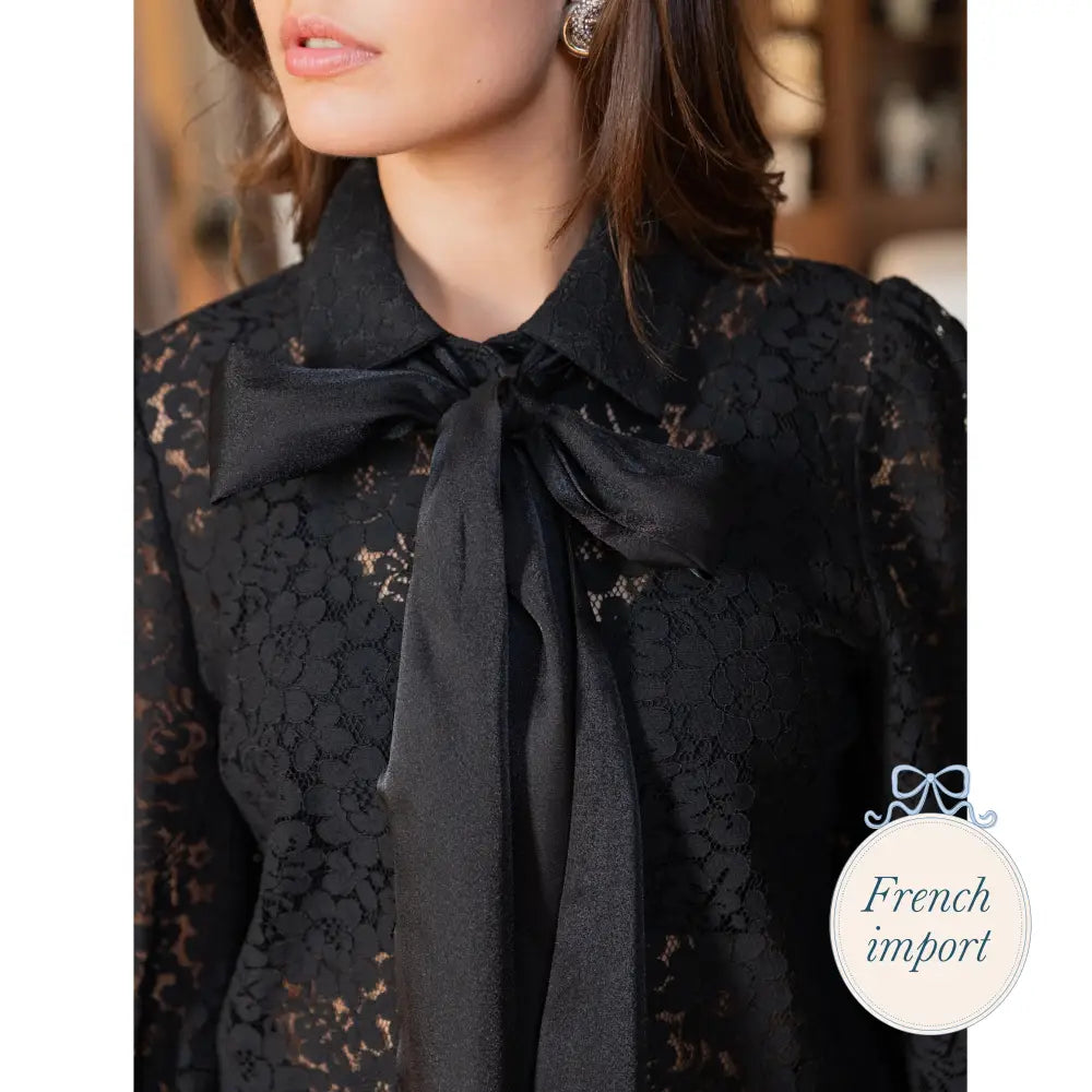 Regular price $59.50Features: Straight and fluid cut, classic shirt collar, front button closure. Removable lavallière bow in satin chiffon. Buttoned cuffs with pleats for a subtle balloon effect. With its delicate lace and removable lavallière bow, this shirt evokes a femininity that is both bold and poetic.