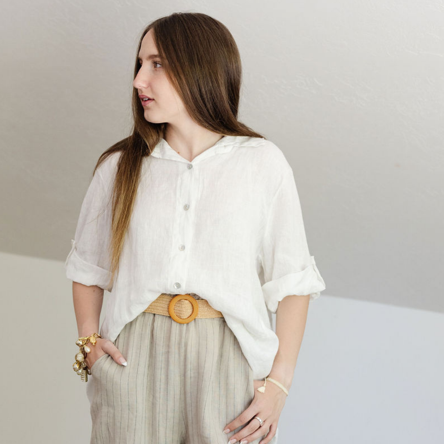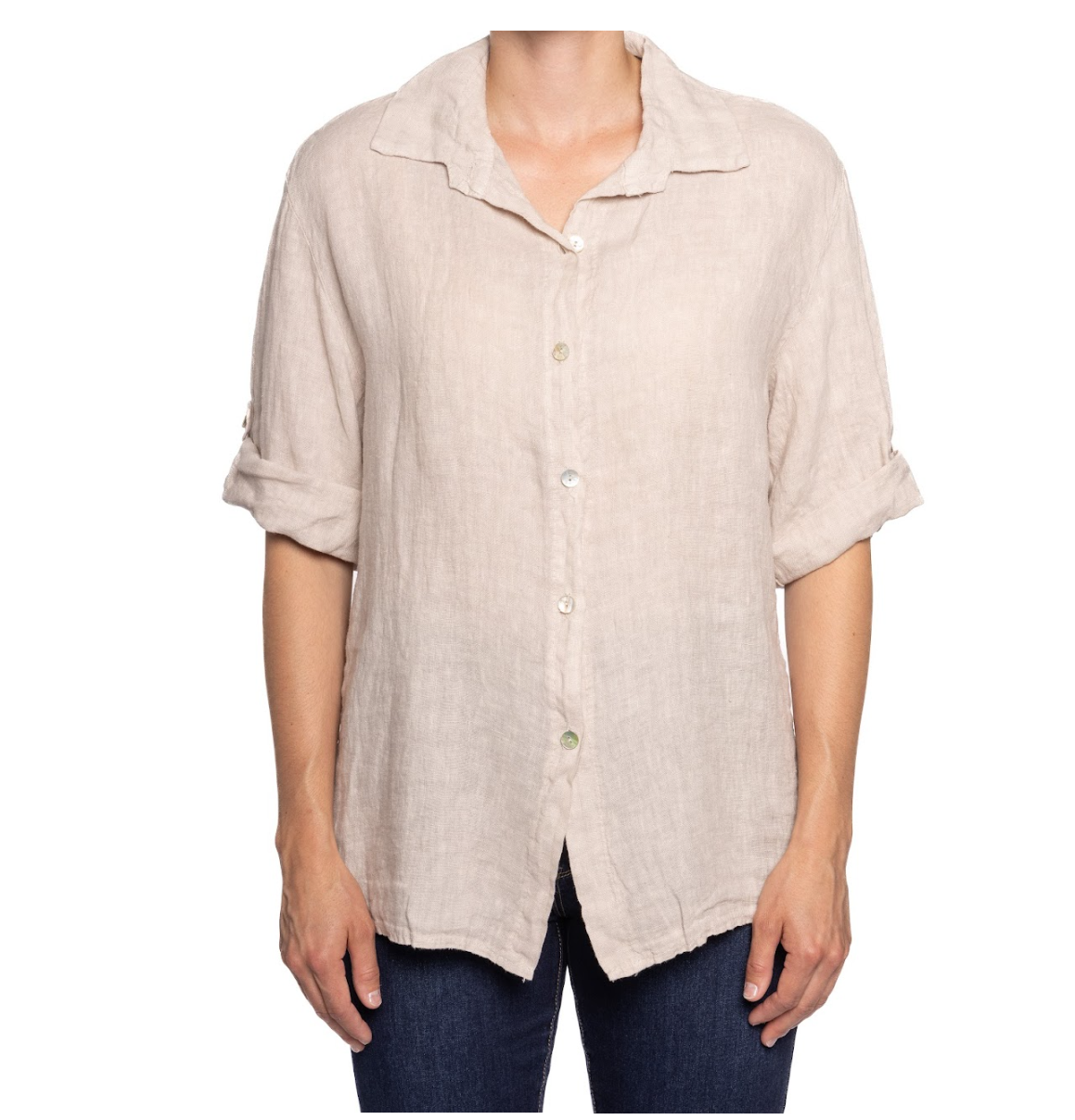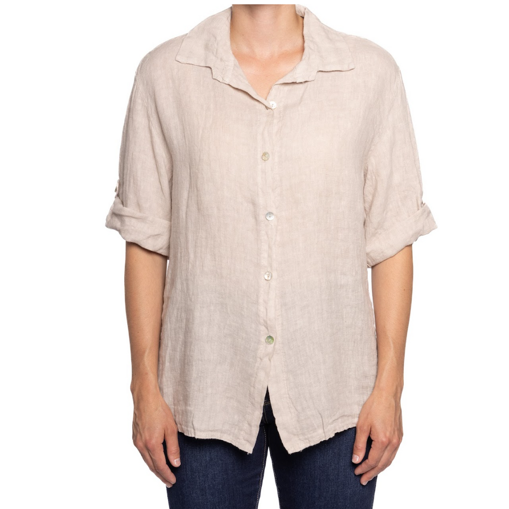 This French Linen Button-Up features a relaxed silhouette, classic collar, and rolled sleeves. Lightweight and breathable, it's perfect for layering or wearing alone—effortlessly chic for everyday elegance or coastal escapes.