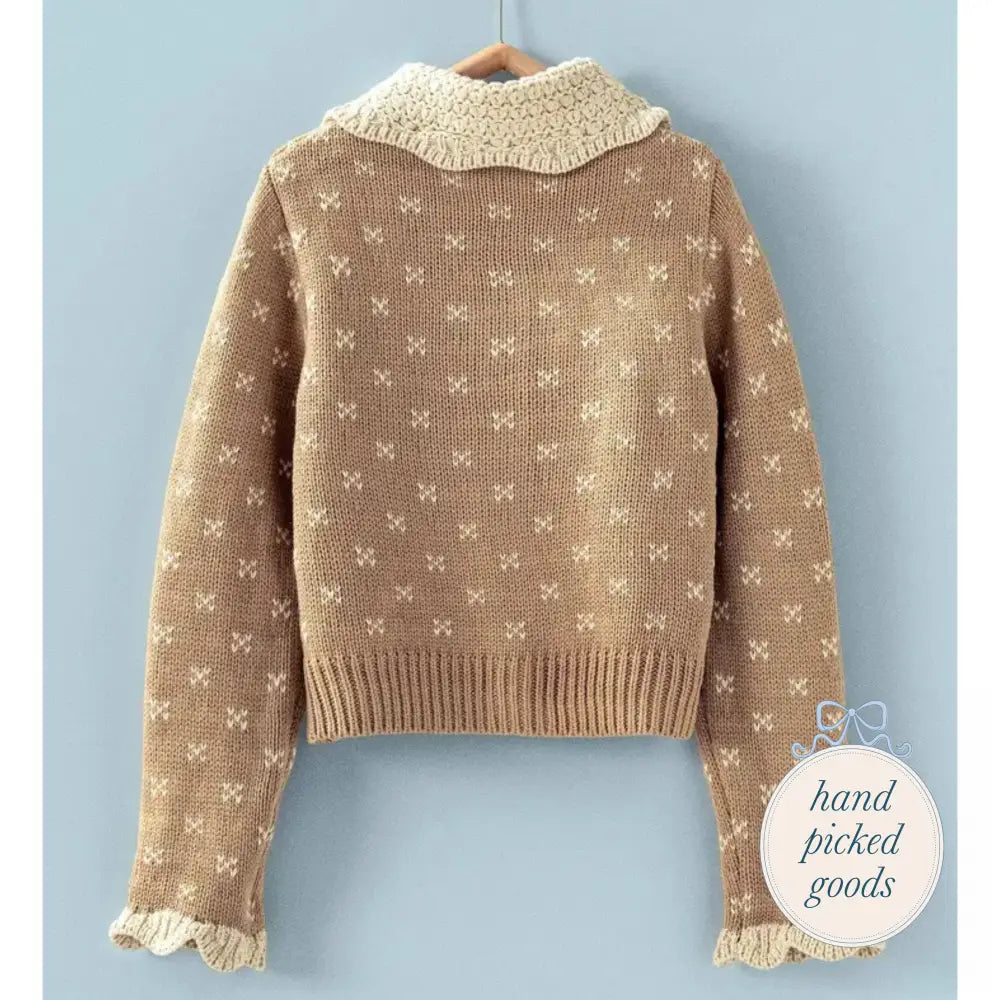 Features: A sweet ruffle collar and matching cuffs, the button-front design is crafted from soft acrylic, offering a cozy yet feminine layer perfect for pairing with high-waisted denim.