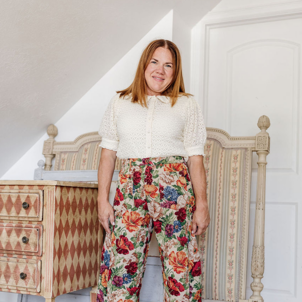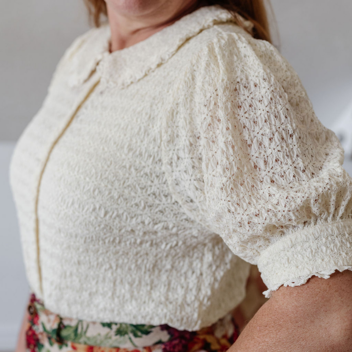 Features: All-over textured cotton blend lace with a feminine Peter Pan collar and short puff sleeves. Self covered button-up front.
