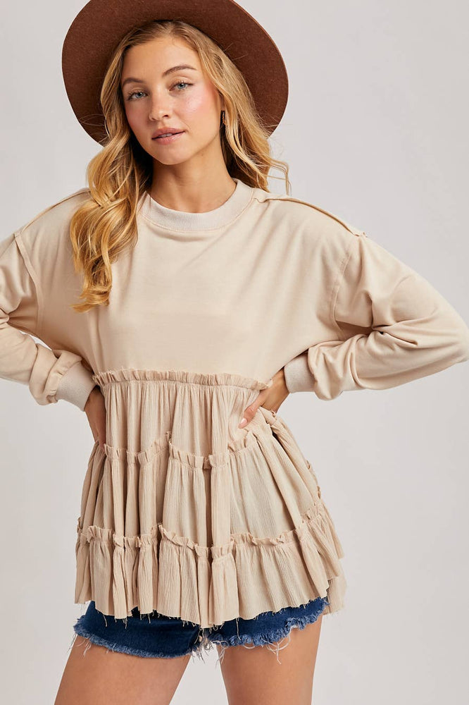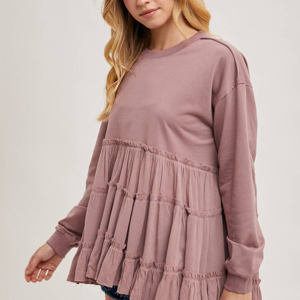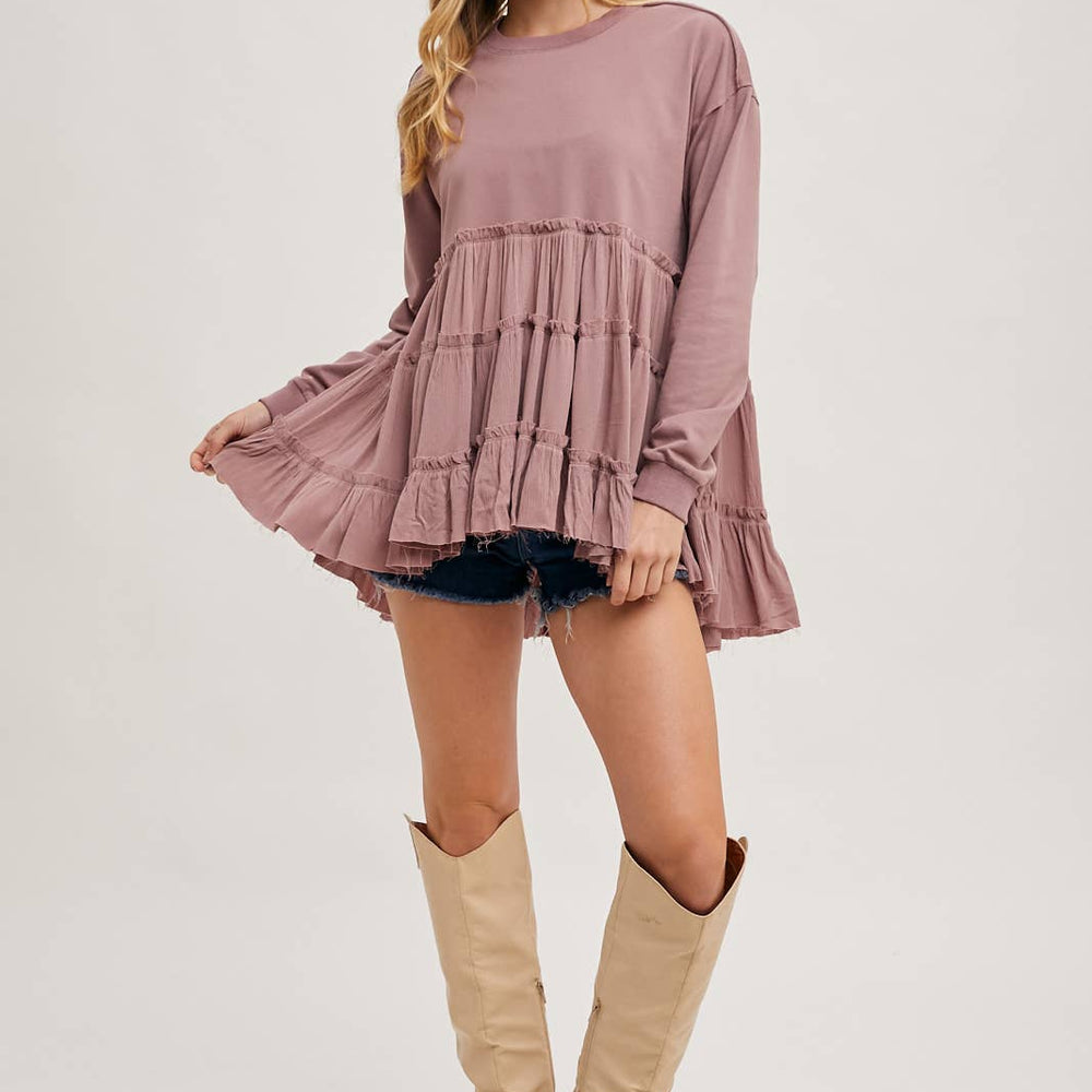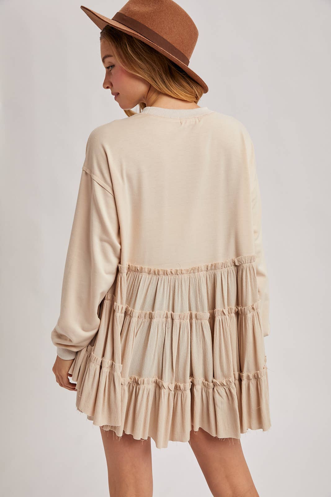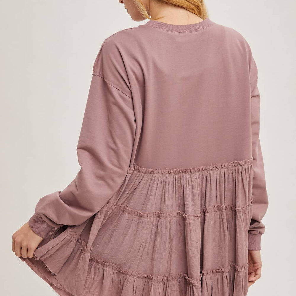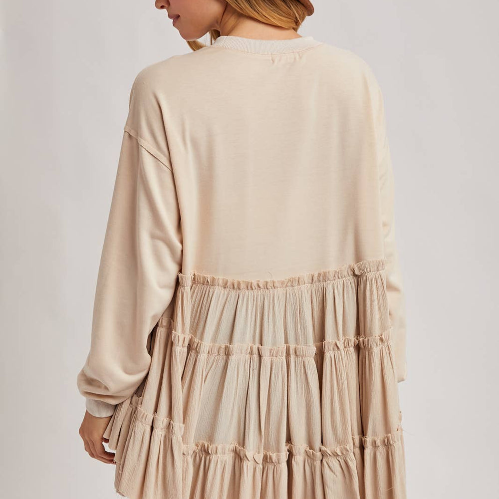 Features: Multiple tiers of ruffles at the hem, round neck.