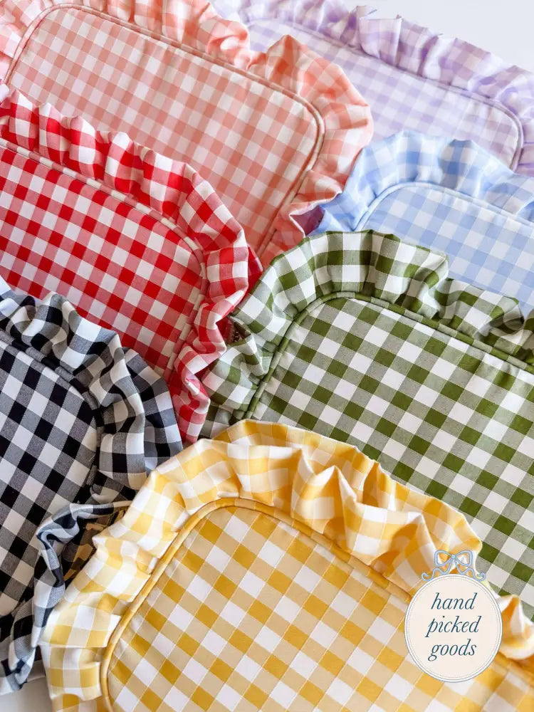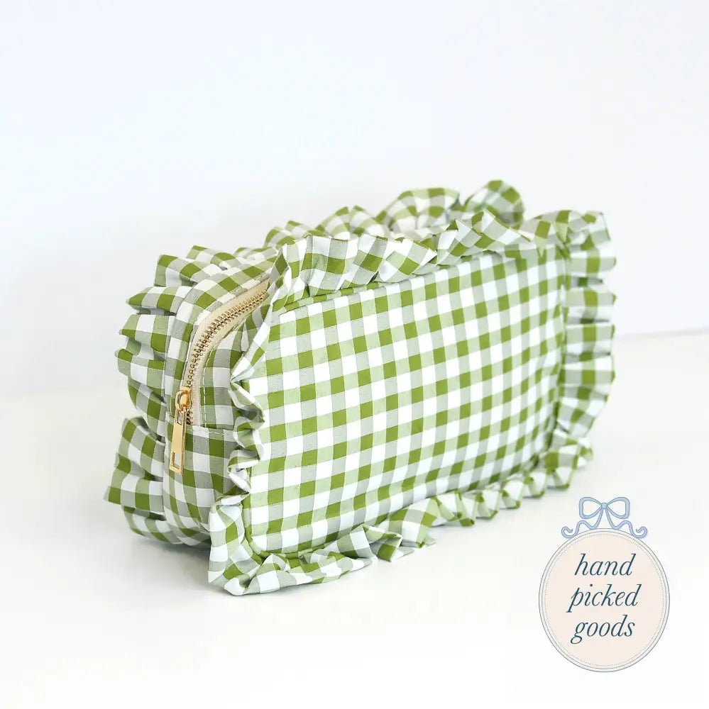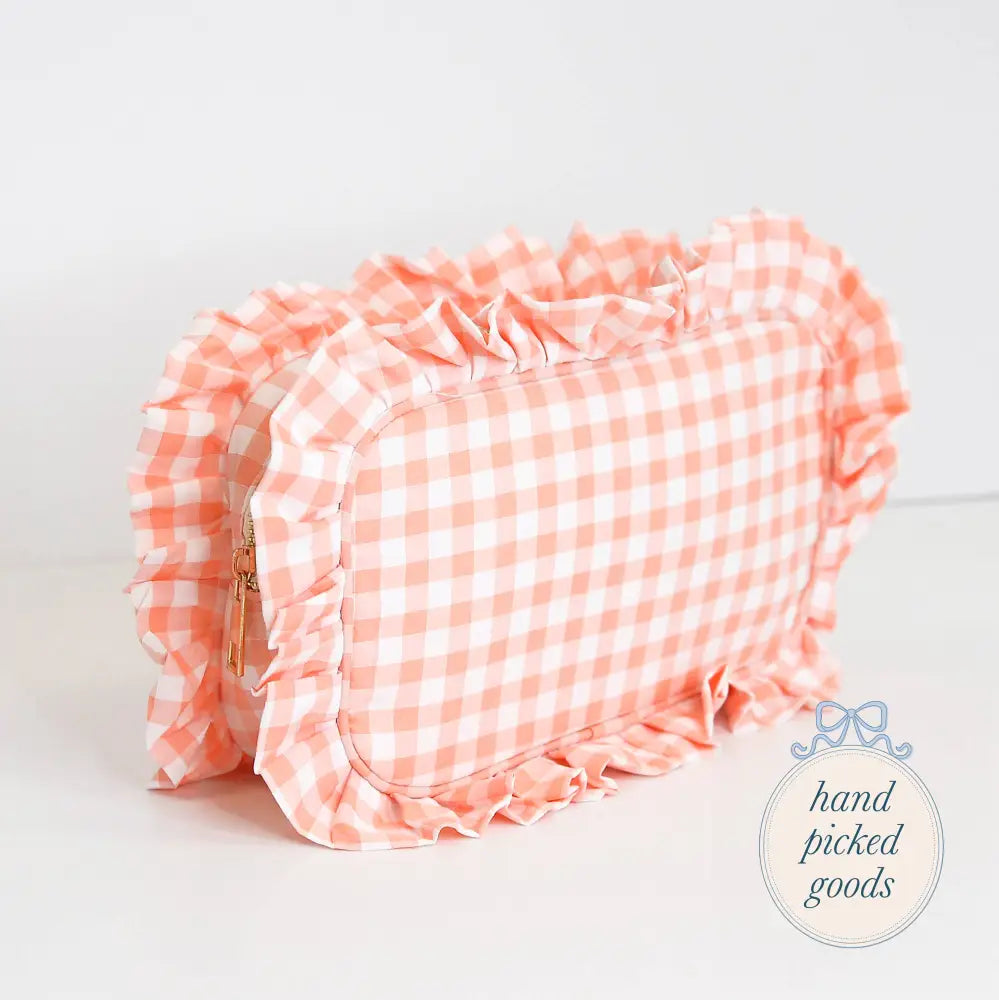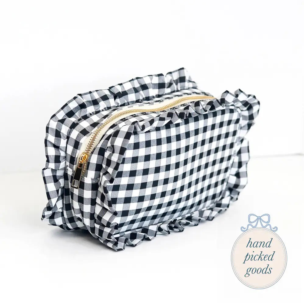 Features: Gold zipper, gingham print, lining on the inside for easy cleanup