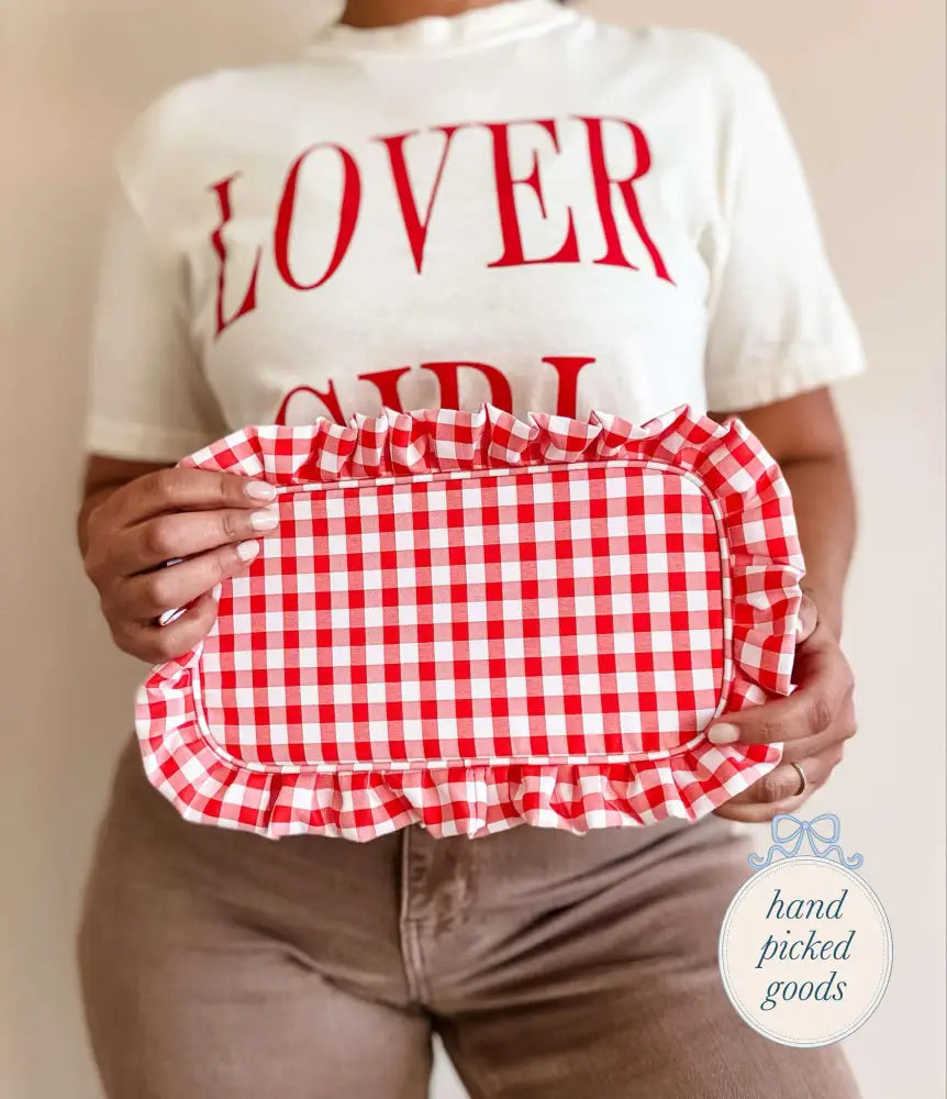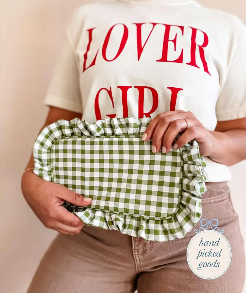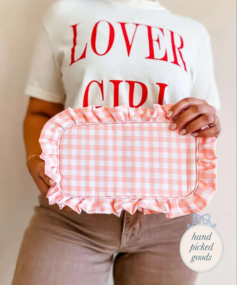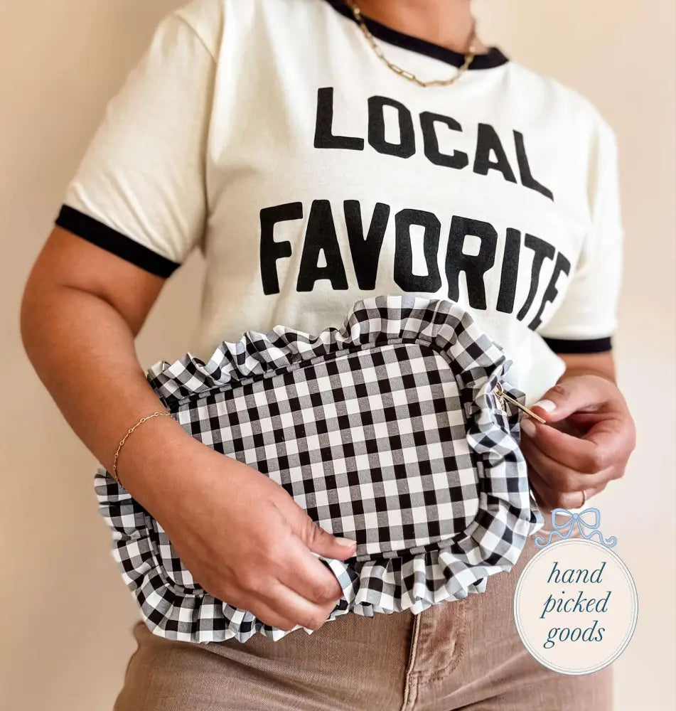 Features: Gold zipper, gingham print, lining on the inside for easy cleanup