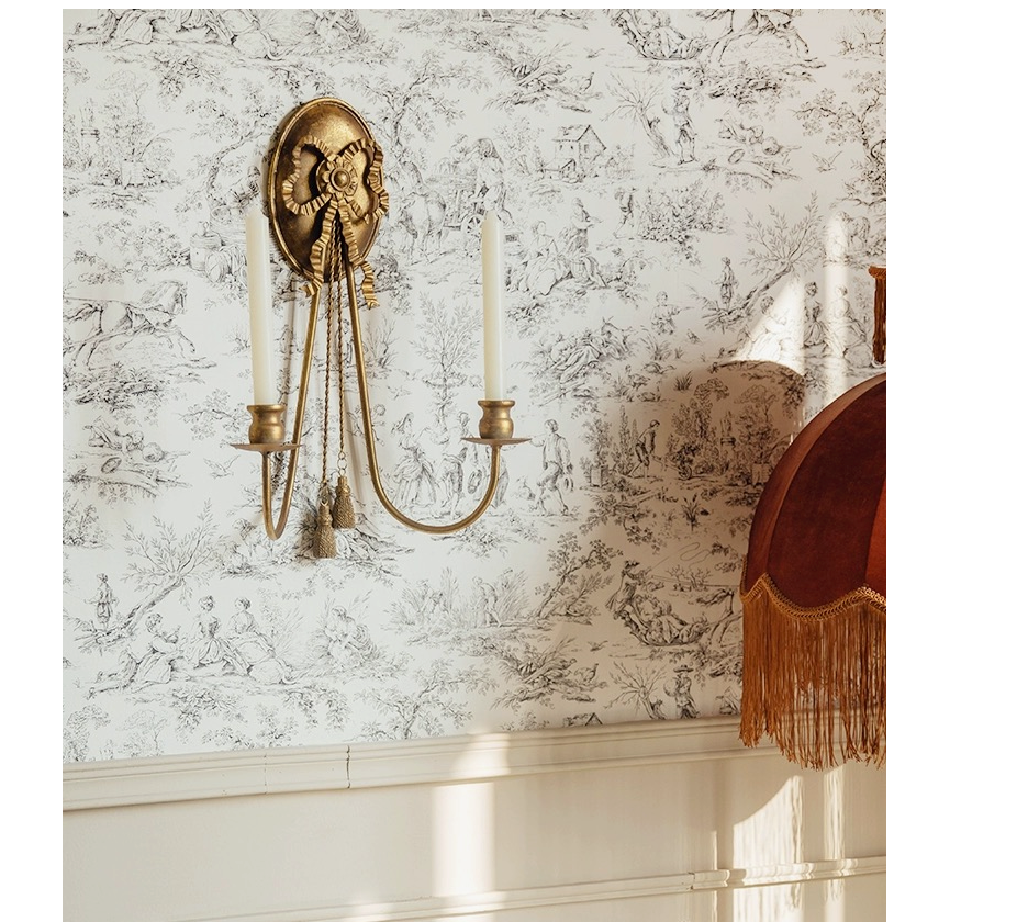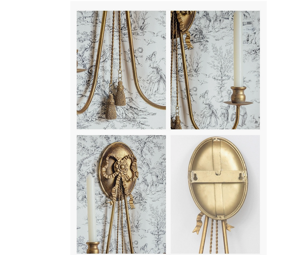 This new elegant two-arm wall sconce captures the romance of 18th-century French design with a graceful silhouette and ornate detailing. A sculpted ribbon bow anchors the oval backplate, cascading into delicate twin tassels that add a whimsical touch of movement. Finished in a warm antique gold, its slender arms curve outward to hold traditional taper candles — perfect for soft, ambient light in an entryway, powder room, or beside a gilded mirror.