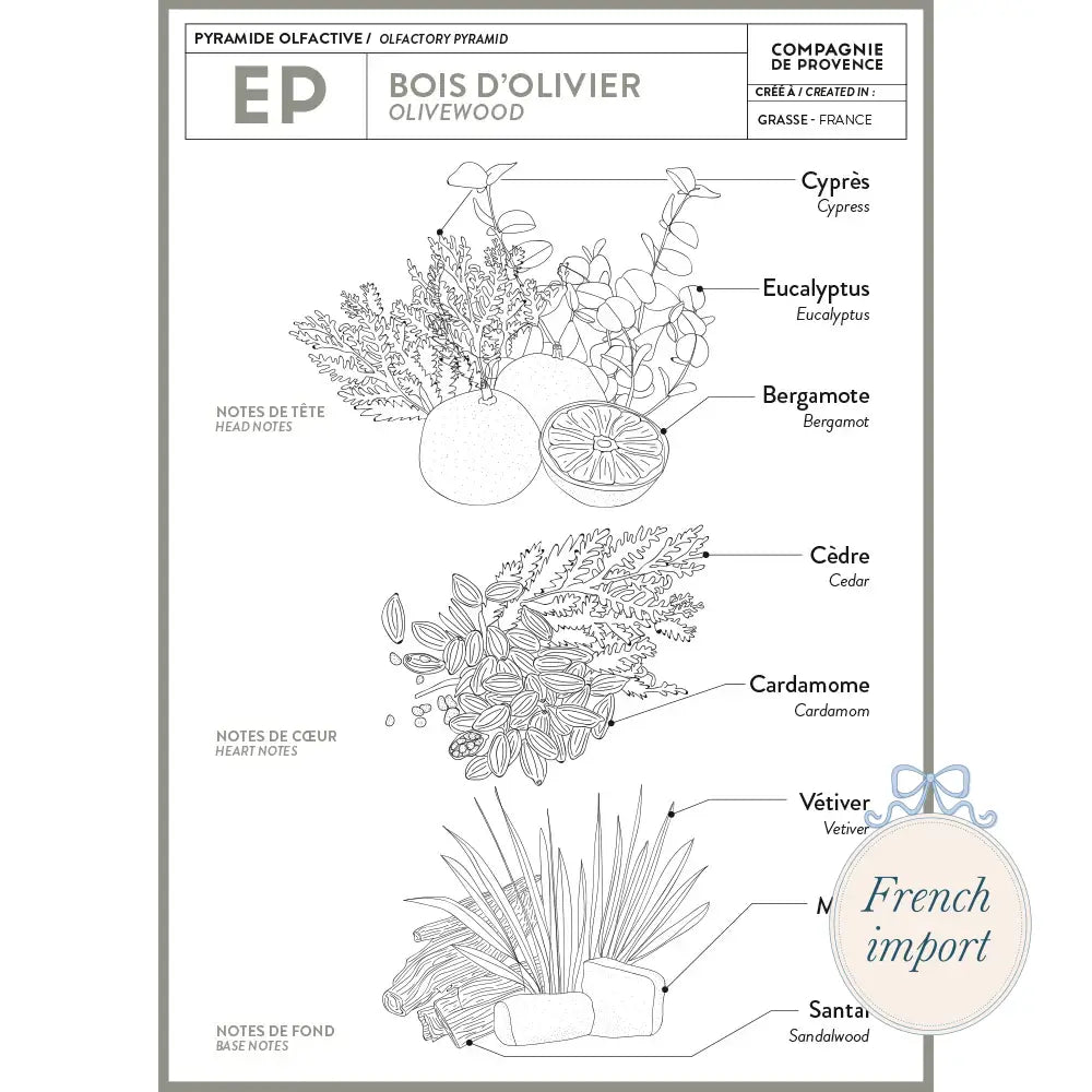 Olive Wood: Water, Potassium Cocoate, Glycerin, Fragrance, Hydroxyethylcellulose, Polyglyceryl-3 Caprylate, Tetrasodium Glutamate Diacetate, Coconut Oil, Potassium Olivate, Sweet Almond Oil, Grape Seed Oil, Tetrasodium EDTA, Limonene, Tocopherol, Linalool, Citral, Eugenol, Alpha-Isomethyl Ionone, Benzyl Salicylate, Disodium Phosphate, Polysorbate 60, Sunflower Seed Oil, Olive Fruit Oil, Sodium Phosphate.