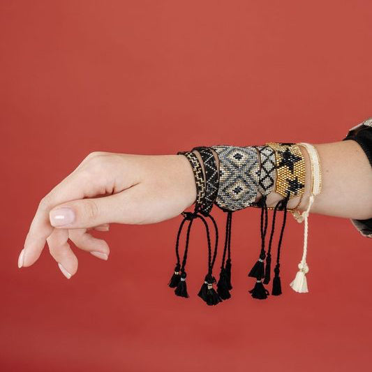Flat Beaded Black Bracelet with Gold Geometric Pattern