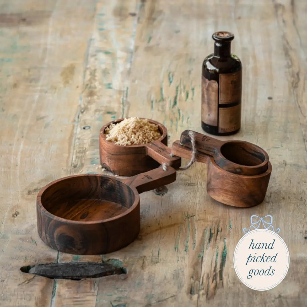 Features: This set of four wooden measuring cups is hand crafted in the tradition of the old-world. Simple and naturally beautiful. 1cup, 1/2 cup, 1/3 cup, 1/4 cup.