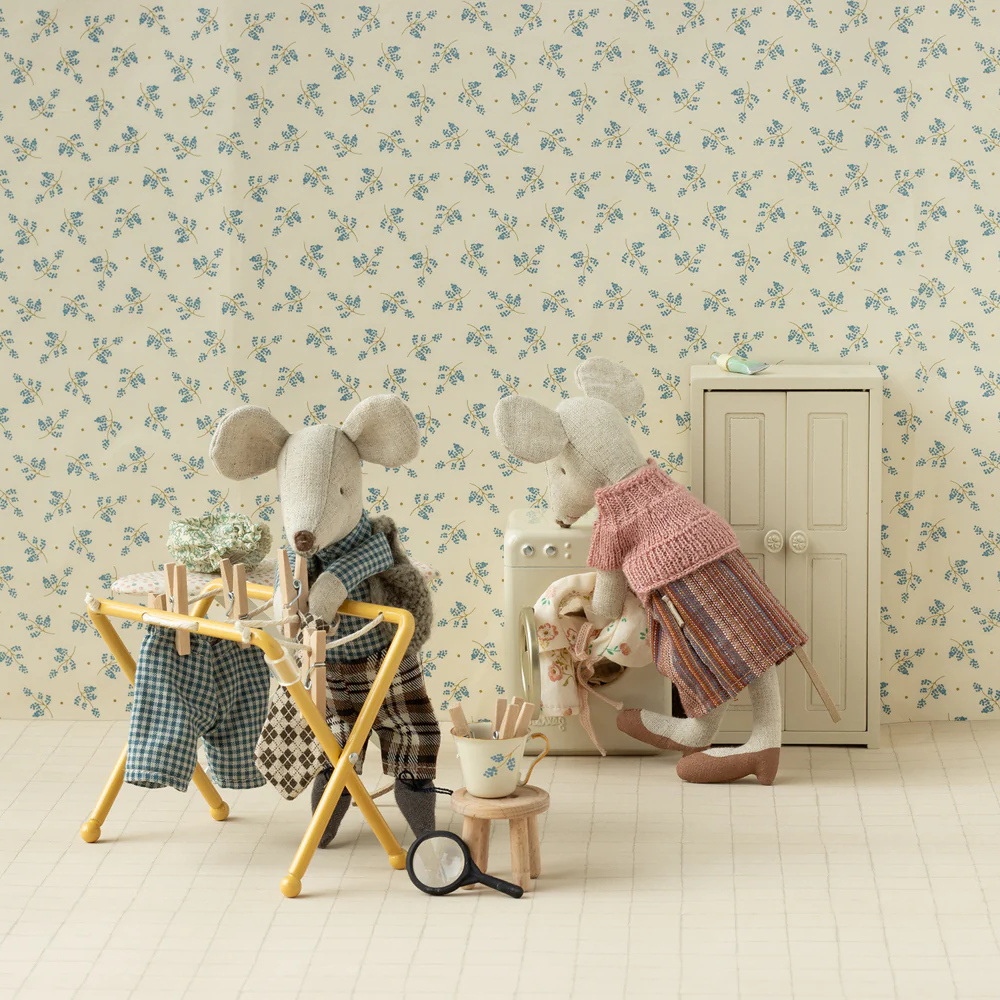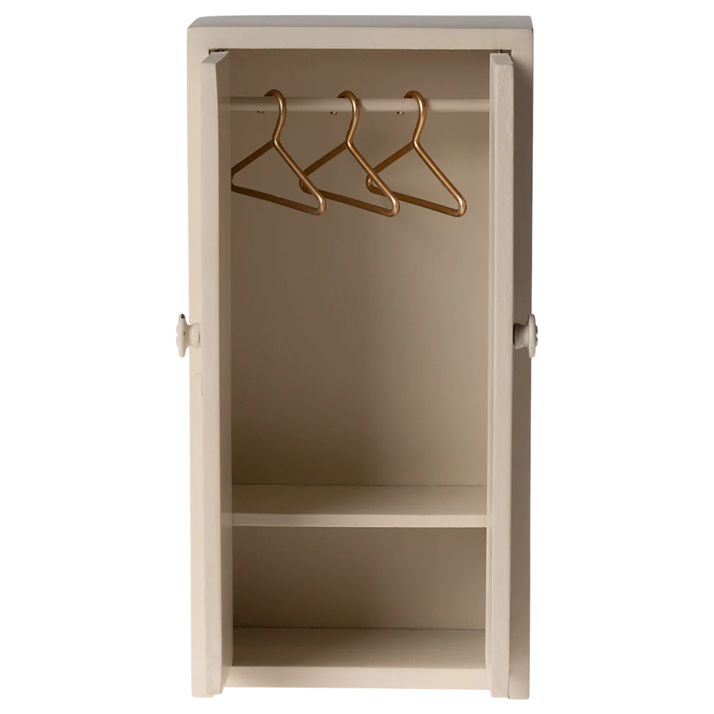 Features: A small closet helps the mice family organize their wardrobe. The closet comes with three golden hangers