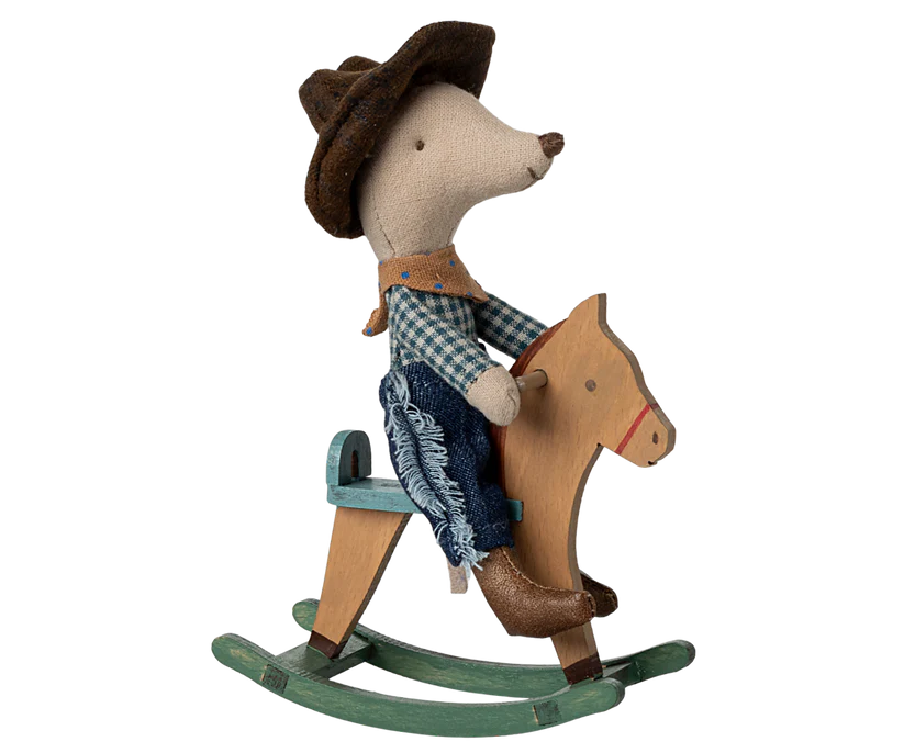 Features: A cowboy mouse with magnets in his hands, dressed in jeans, a scarf, and a cowboy hat. Notice the small tail hole on the horse.