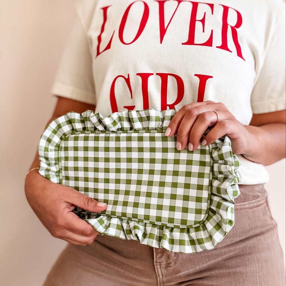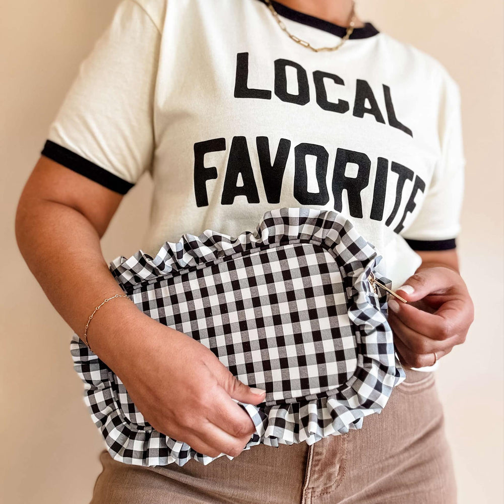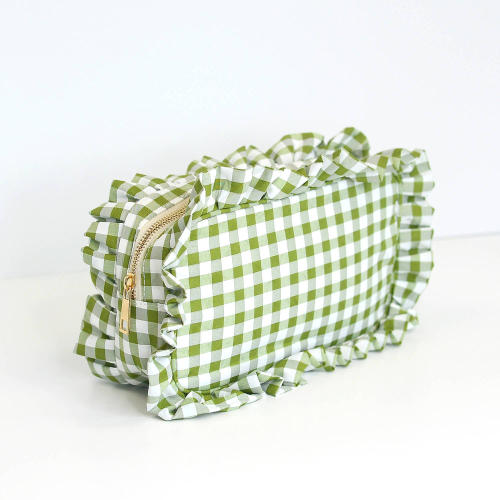 Features: Gold zipper, gingham print, lining on the inside for easy cleanup