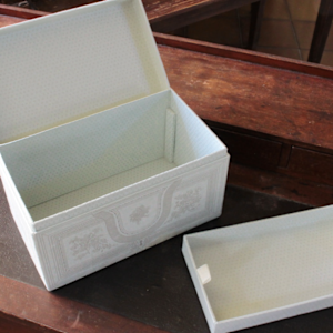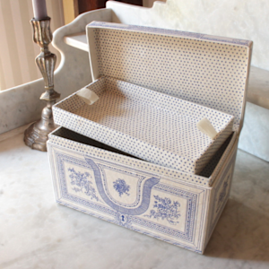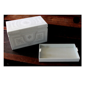 Features: A classic hinged lid, removable tray, and intricate patterning.
