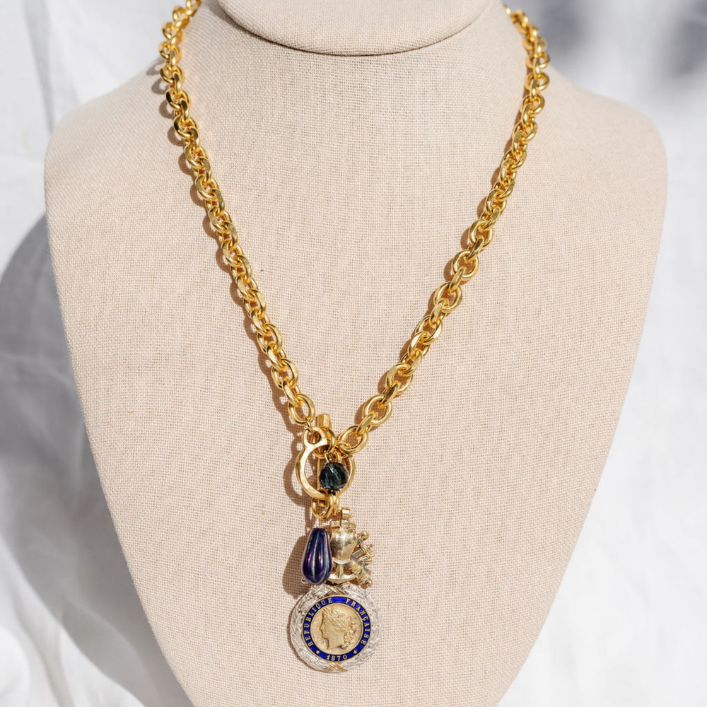 Authentic 1870 République Française medal, elegantly framed in a gold and enamel setting. The medal bears the profile of Marianne, a timeless symbol of liberty and the French Republic. Suspended from a bold gold chain and accented with delicate charms, this piece beautifully blends French history with statement style.