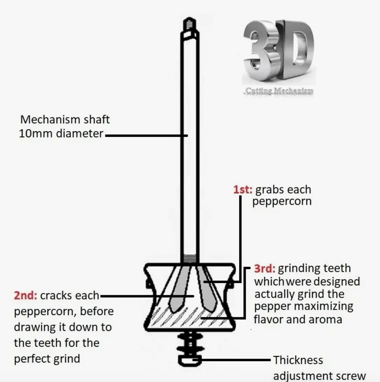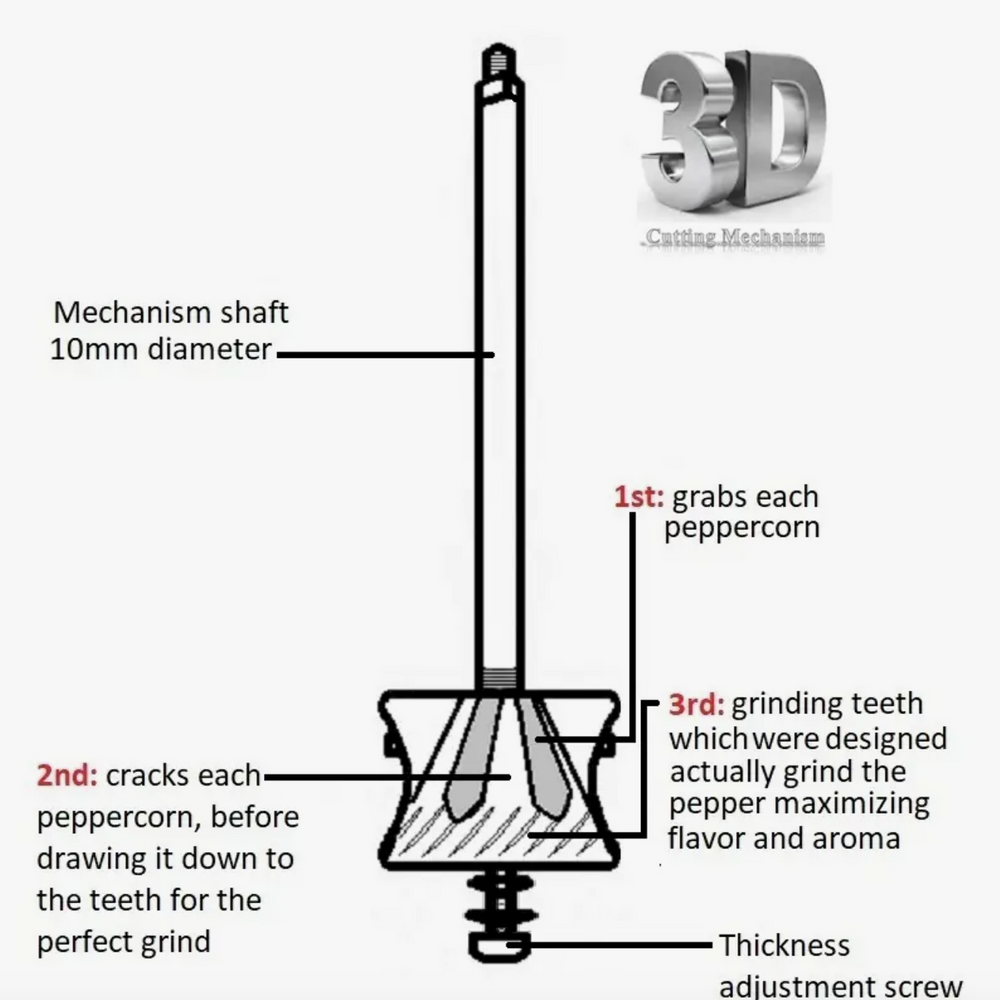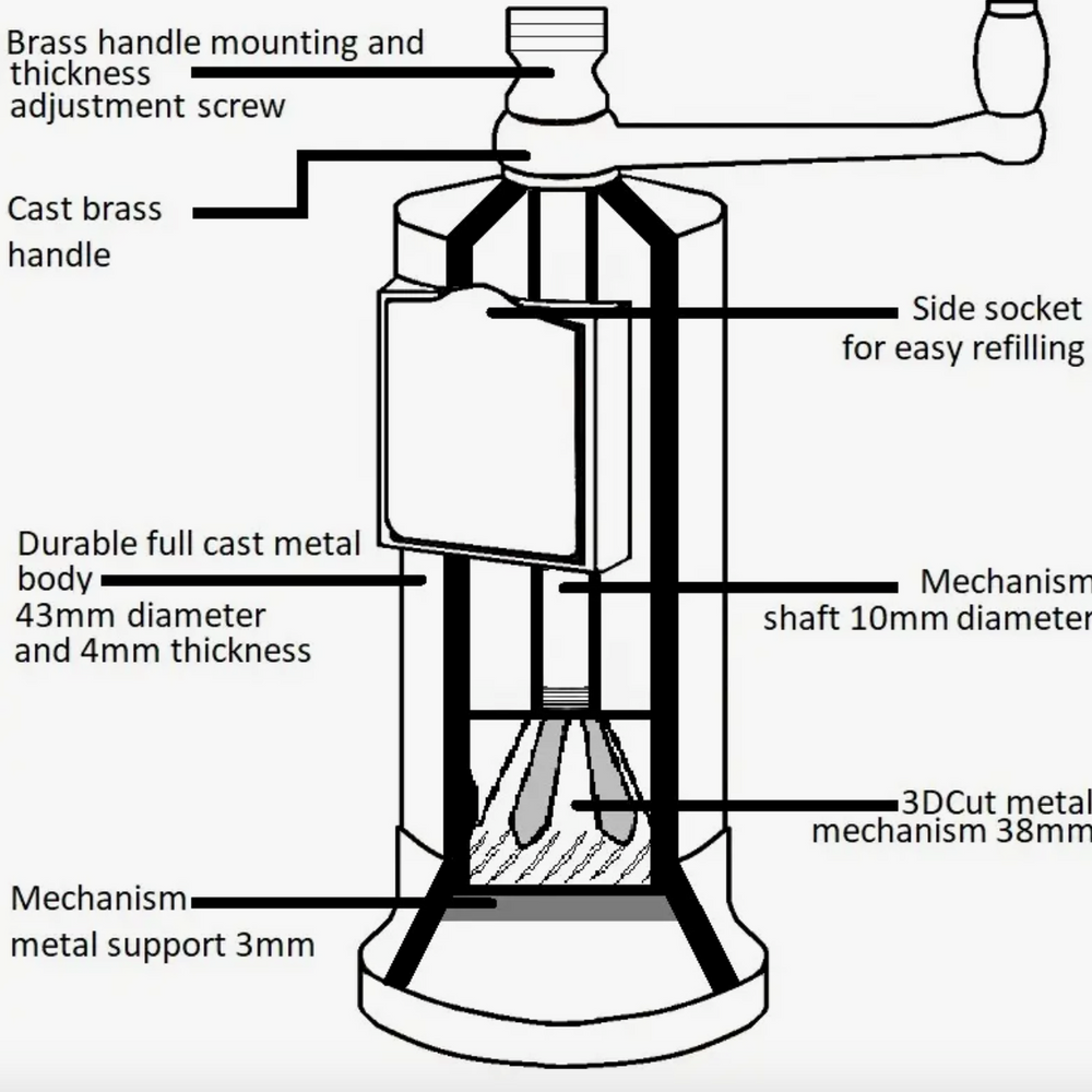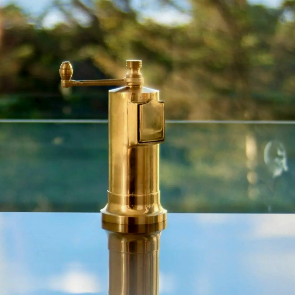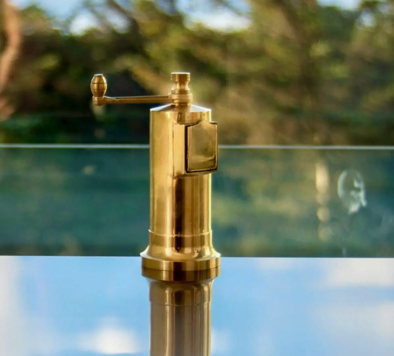 This well-proportioned and heavy pepper grinder is made of solid brass. The spices are added through the opening in the side, so you do not have to disassemble the grinder to fill it up. The opening hatch is manufactured with a tight fit, and opens easily using a tool such as a knife or a spoon. Intended only for peppers and other dried spices - not salt. The 3-part grinding mechanism first guides the spice down into the mechanism, after which it is coarsely ground and finally completely finely ground. 5.3" H
