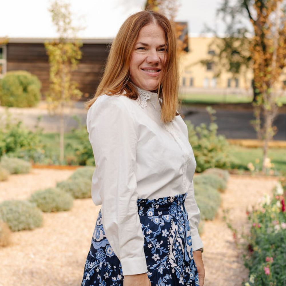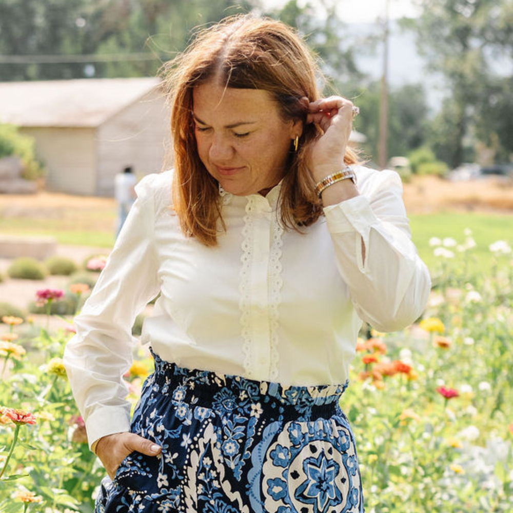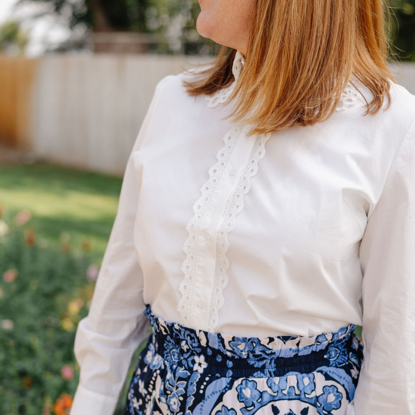 Features: Central button placket with tone-on-tone mother-of-pearl buttons, Peter Pan collar in openwork, finely crafted eyelet embroidery, discreet gathers at the shoulders for delicate volume, scalloped lace trim along the button placket, simple buttoned cuffs.